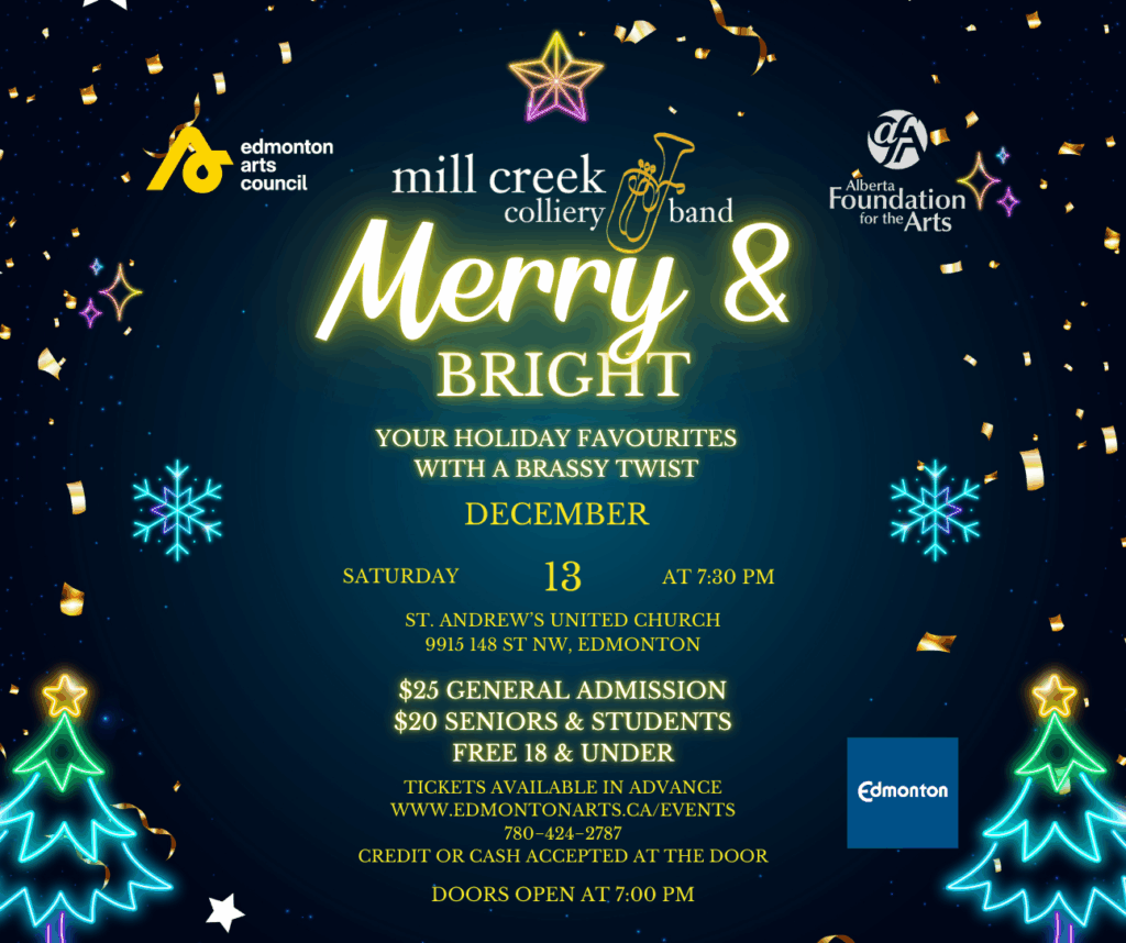 - December 13th – Merry & BrightTickets available HERE through Edmonton Arts Council. Join Mill Creek Colliery Band for their presentation of Merry & Bright on Saturday, December 13 at St. Andrews United Church, 9915 148 St NW. Performance begins at 7:30PM. Celebrate the season with the Mill Creek Colliery Band at “Merry & Bright”, a festive concert featuring your favorite holiday tunes with a lively, brassy twist- and plenty of audience participation! Join in on a holiday carol singalong and make it a truly memorable evening. This family-friendly performance promises an evening of classic holiday music, performed with the energy and warmth that only a community brass band can deliver. Bring the whole family and introduce young music lovers to the joy of live performance, admission is completely free for youth 18 and under. The Mill Creek Colliery Band is proud to be supported by the Alberta Foundation for the Arts (AFA) and the Edmonton Arts Council, helping bring live music to the community. Don’t miss this festive celebration. Sing along to your favorite carols and enjoy sparkling brassy renditions of beloved seasonal favorites! Due to the volume of colliery bands, hearing protection for younger children is recommended. The Mill Creek Colliery Band (MCCB) seeks to promote the British brass band tradition in Western Canada, employing all the traditional instruments of that ensemble. The name of the band pays homage to the historical connection between 19th century working class northern England, and the brass bands which flourished during that time. The name also refers to a prominent ravine area in Edmonton, itself the site of important coal mining activity in the early days.